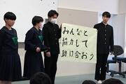 11月6日(木)、生徒会執行部の新旧交代式を行いました。10月28日(火)、生徒会選挙が行われ、新しい生徒会長や副会長等が選ばれました。そして、新旧交代式。まず、3年生を中心とした旧生徒会役員が一人ひとり、今までの協力への感謝の気持ちや、新しい役員へのエールを述べました。そして、旧生徒会長から新生徒会長へ、校旗を受け渡すとともに、熱い気持ちを伝えました。その後、新会長がこれからの決意を表明しました。新執行部の皆さん、頑張ってください。