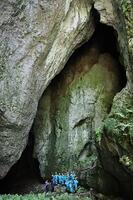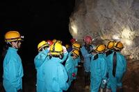 その後、「宇山洞」へ移動し、学区内に在住の岡さんの指導のもと、洞窟探検をしました。また、岡さんから新見や大佐の自然についてのお話を聞きました。生徒は初めての洞窟探検。最初は恐る恐るでしたが、自然の壮大さや不思議さを感じながら、楽しく、洞窟を探検しました。